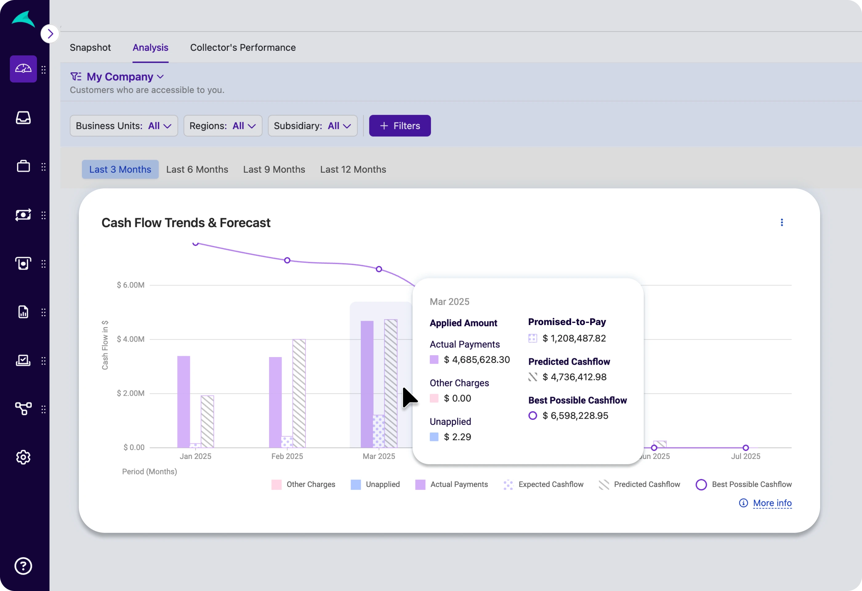- Expected vs. predicted vs. best-case scenarios based on historical payment behavior