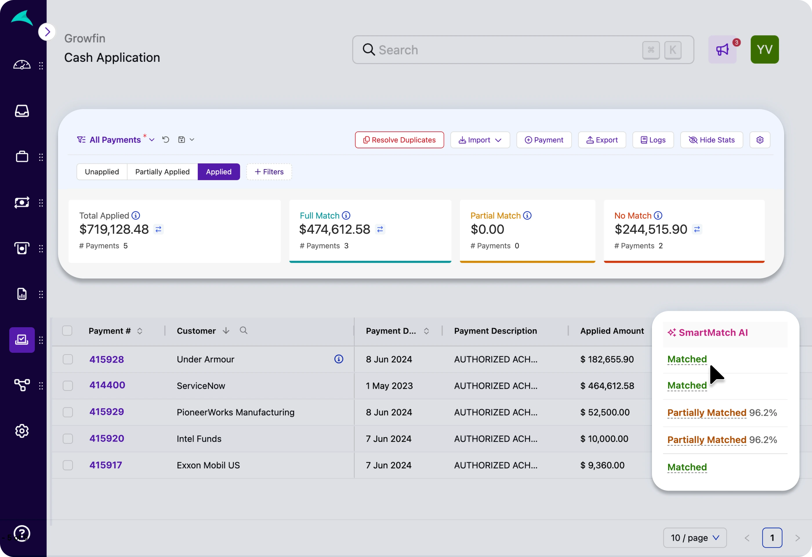 AI-Powered Matching: Machine learning algorithms that match incoming payments to outstanding invoices using pattern recognition and historical data.