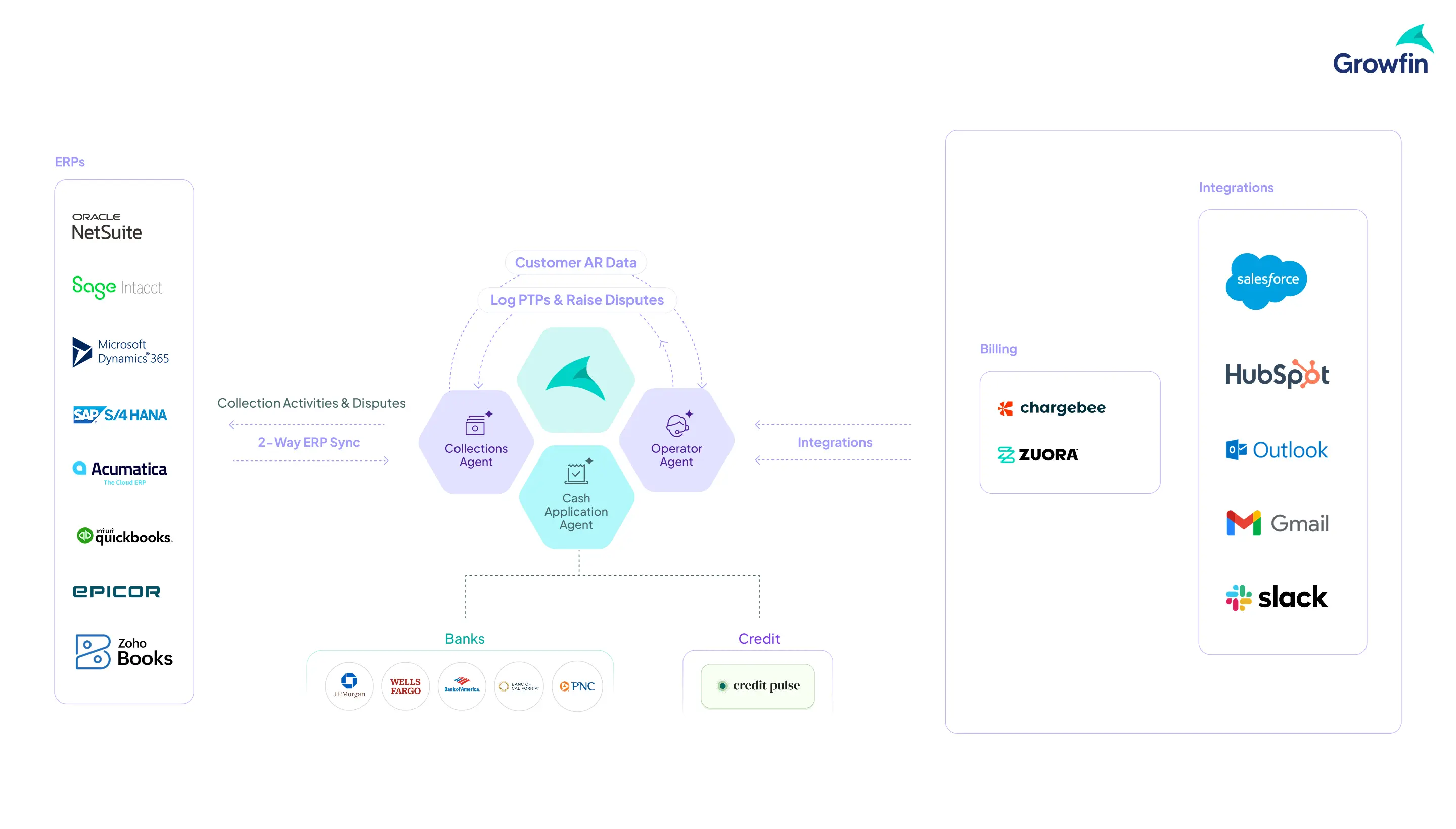 Growfin's agentic architecture brings this to life through purpose-built AI agents that operate across the credit-to-cash lifecycle while connecting natively to the systems finance teams already use: ERPs (NetSuite, Sage Intacct, Microsoft Dynamics 365, and others), CRMs (Salesforce, HubSpot), billing platforms (Chargebee, Zuora), banking systems, and communication tools (Outlook, Gmail, Slack).