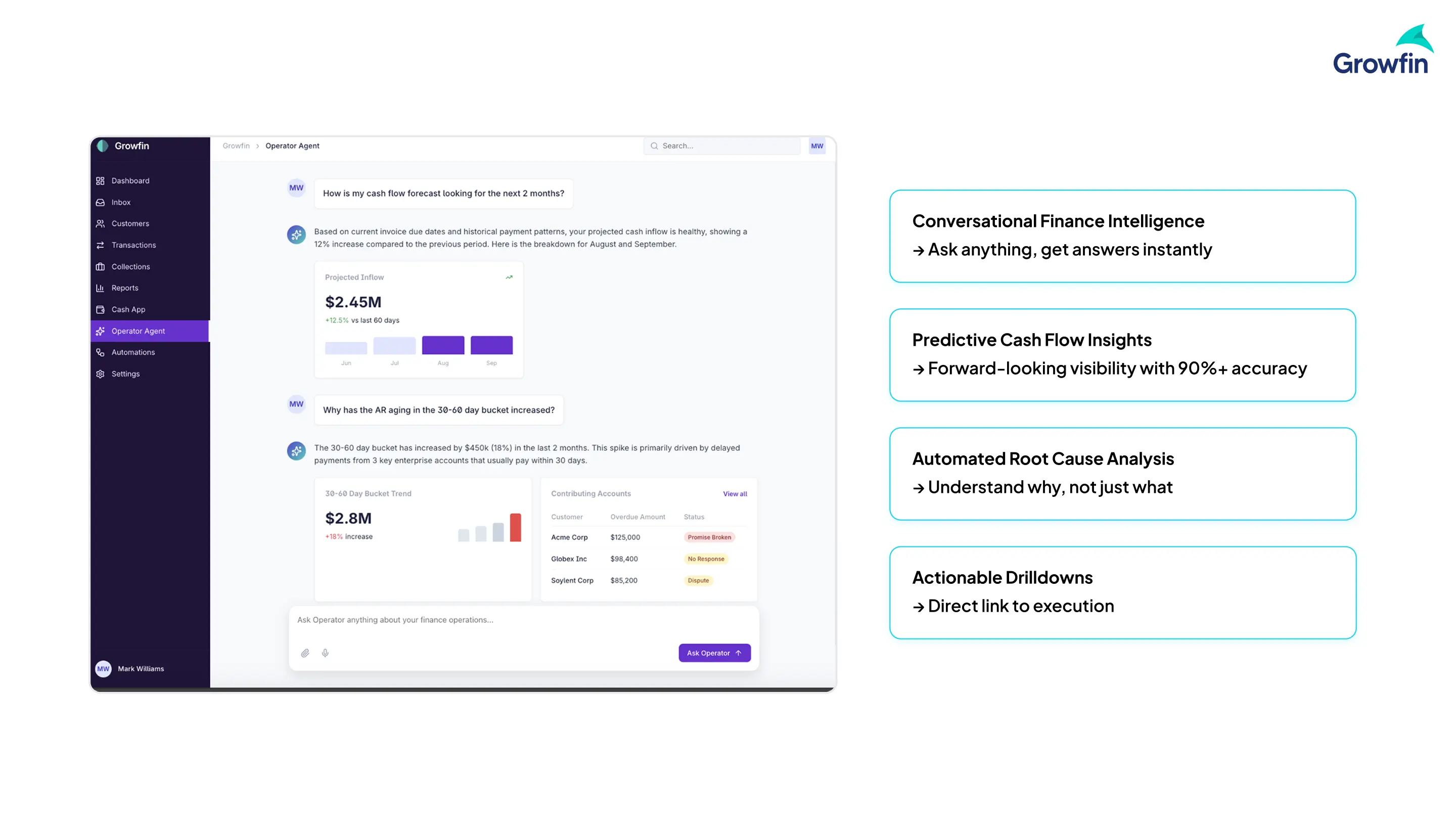 The Operator Agent provides conversational finance intelligence. Finance leaders can ask natural-language questions ("How is my cash flow forecast looking for the next 2 months?" or "Why has the AR aging in the 30-60 day bucket increased?") and receive instant, data-backed answers with drilldowns to contributing accounts and root causes.