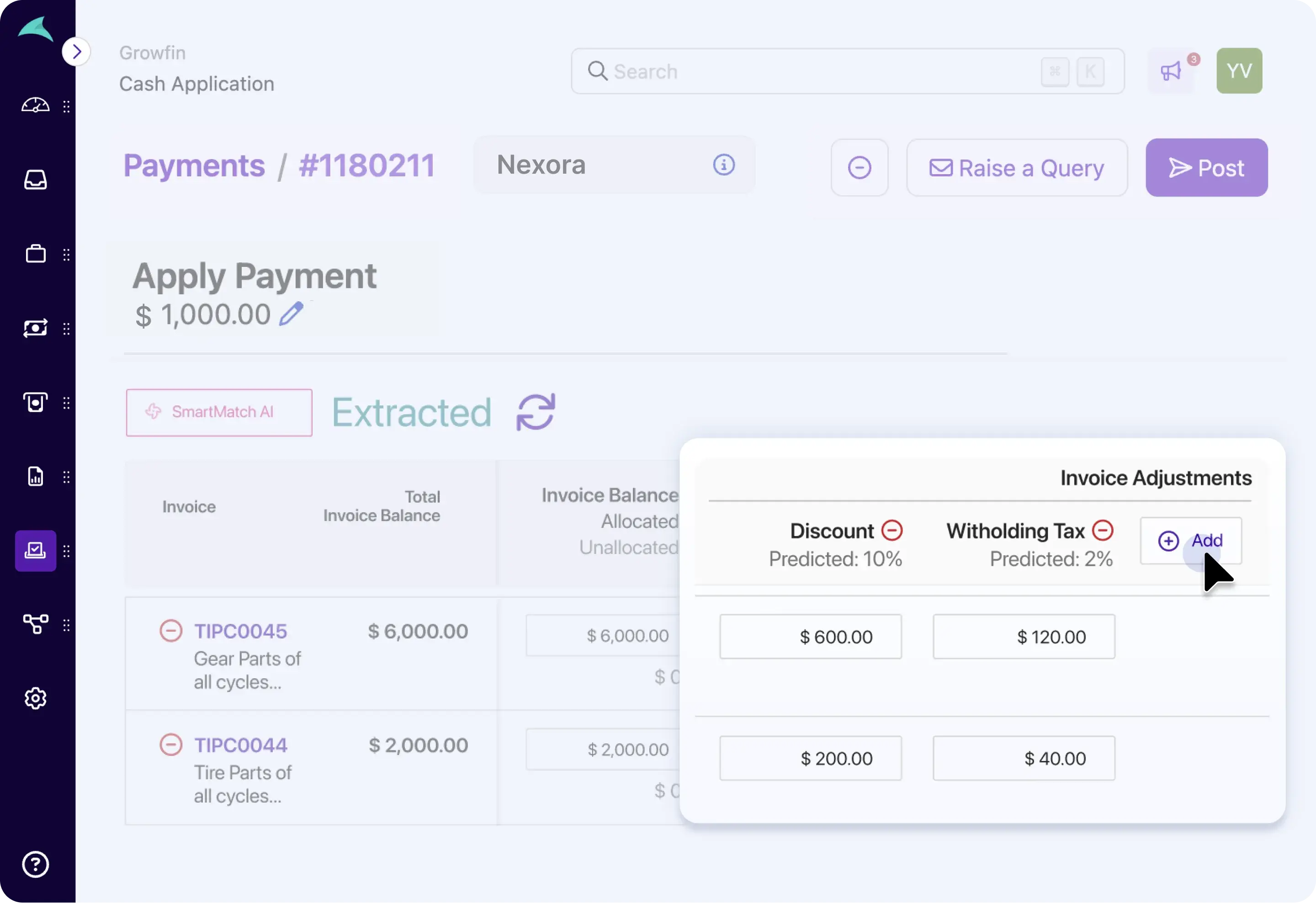 - Automatically identify common deductions (taxes, bank fees, FX, discounts).