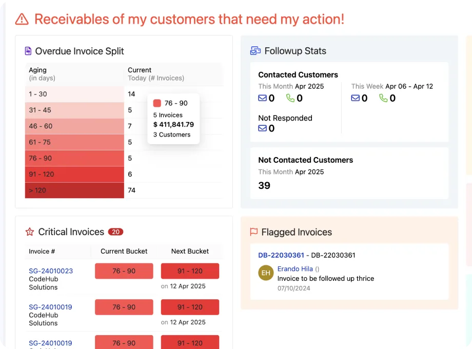 Each team member gets a real-time view of their tasks, follow-ups, promises to pay, and customer risk, ensuring nothing falls through the cracks.
