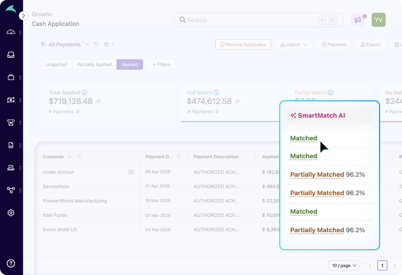 Auto-match payments at scale in real time, without manual effort slowing you down. Growfin’s SmartMatch AI matches up to 80% of payments without human intervention across currencies, entities, and inconsistent invoice formats. Every match is backed by a confidence score, giving your team complete visibility.
